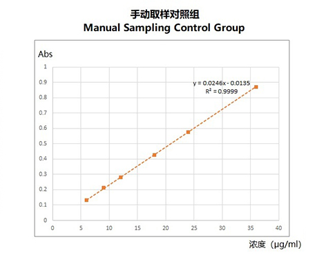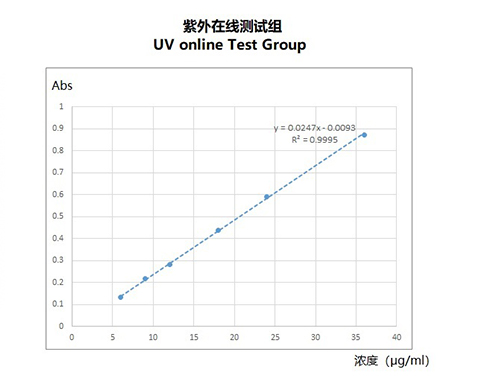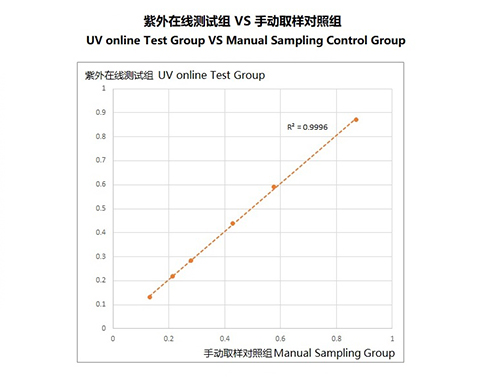 紫外在線測(cè)試結(jié)果呈現(xiàn)優(yōu)秀的線性相關(guān)性,R平方值為0.9995,與手動(dòng)取樣對(duì)照組(0.9999)無顯著差異。