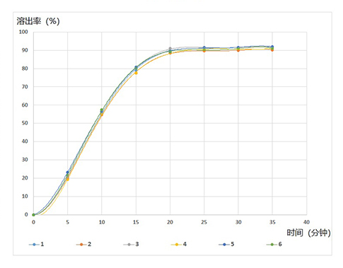 使用銳拓在線紫外自動(dòng)檢測(cè)溶出系統(tǒng),設(shè)定溶出參數(shù):籃法;轉(zhuǎn)速:100RPM;溶出介質(zhì):900ml純水;溫度:37.0℃;紫外檢測(cè)波長:257nm。樣品自動(dòng)同步投藥后,系統(tǒng)每隔5分鐘自動(dòng)取樣并執(zhí)行在線紫外檢測(cè),通過吸光度結(jié)果換算出樣品溶液的濃度,并進(jìn)一步求得其溶出率。
